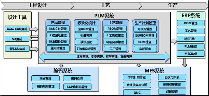 通过NX三维零件设计、EPLAN电工电路设计应用,使技术人员能够迅速建模,为智能制造提供智慧方案。通过开展PLM、ERP与MES的系统集成,实现以BOM为核心的数据贯通和以业务为核心的流程贯通。管理人员只需打开MES,轻点鼠标,各工序的生产情况、产出及库存情况、成品库存等就能呈现眼前。系统的集成应用,使零件库存降低49.24%,核心产品生产周期由21.3天缩短为18.1天,生产效率提升30%,产品不良率降低20%,电子化质检卡使减少用纸12万张。
