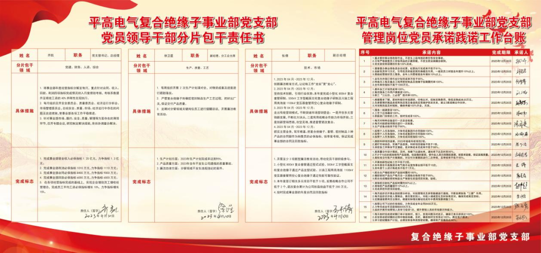 “承诺”不仅要上墙,更要上心。williamhill官网复合绝缘子事业部同步开展党员领导干部分片包干活动。领导干部签订《党员领导干部分片包干责任书》。班子成员聚焦分管领域的年度重点工作,明确路线图、制定时间表,挂图作战,销号管理,推进重点工作落地落实。保证承诺有结果,践诺有实效。
