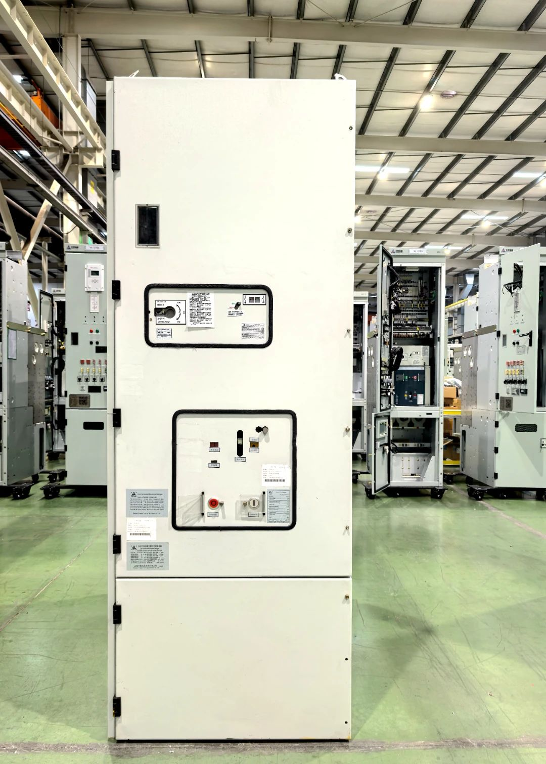 “N2X-24 (Z)/T1250-25 户内环保气体绝缘金属封闭开关设备”采用纯氮气绝缘技术,在零表压下实现卓越绝缘性能。通过对屏蔽型24千伏氮气绝缘环氧固封极柱、24kV-1250A自补偿型侧扩母线插拔连接器、小断口复合屏蔽直动式三工位开关、棒型母线屏蔽圈等核心元件的研发,成功研制母线侧扩的额定充气压力0.12MPa(20℃)氮气绝缘充气柜。产品在零表压下的满足GB、DL及IEC标准要求的绝缘耐受水平和1.1倍电流下自然散热的温升水平,整机局放水平在1.1倍额定电压下低至10pC以内。产品柜宽仅为600mm,与同规格的SF6气体绝缘开关柜相同,对标国际知名品牌的环保开关柜充气压力最低、尺寸最小。产品在零表压条件下通过GB3906-2020、DL404-2018、IEC62271-200标准规定的全套型式试验并取得ASTA和TUV国际双认证,满足额定频率50Hz和60Hz的使用条件。产品目前已成功应用于合肥电力公司滨湖顺园3号、4号总开闭所等示范工程,产品综合性能指标达到国际先进水平。